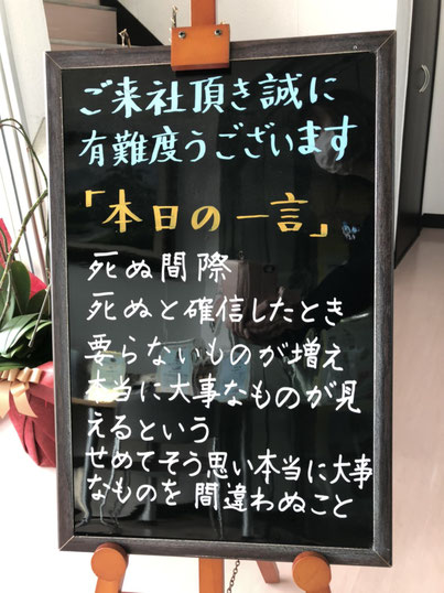 TAKESHI DIARY · 2020/02/25 20200225今日のひとこと 死ぬ間際 死ぬと確信したとき 要らないものが増え 本当に大事なものが見えるという せめてそう思い 本当に大事なものを 間違わぬこと tagPlaceholderカテゴリ: コメントをお書きください コメント: 0